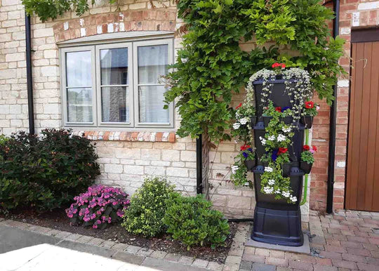Rainwater Terrace is a series of individual 67 litre water butts that stack together and can connect sideways to suit any space. Rainwater diverted from your down-pipe cascades through the whole Terrace filling all the water butts and watering plants in the clip-on planters as it goes. Once the bottom butt is filled, any excess water goes back to the drain or can be diverted elsewhere in the garden, so the water is refreshed, and stagnation is avoided. There are taps on each level on the end of flexible drain tubes. These are fast (fill a watering can in 20 seconds!) and transparent so you can see how much water you have left. The Rainwater Terrace water butt looks great decorated with flowers, herbs or even veg!