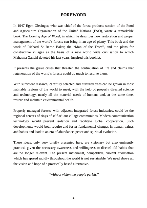 This book and the work of Richard St Barbe Baker, the “Man of the Trees”, and the plans for constructive villages as the basis of a new world wide civilisation to which Mahatma Gandhi devoted his last years, inspired this booklet.